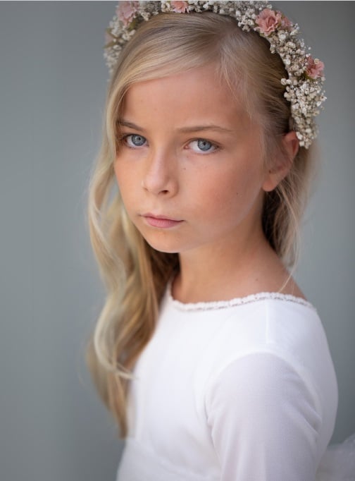 Das Kommunionskleid wird traditionell mit einer Vielzahl von Accessoires ergänzt, die den festlichen Look abrunden. Als Kopfschmuck wird meist ein Blumenkranz oder eine feine Tiara aufgesetzt, die dem Outfit einen modernen und mädchenhaften Touch verleiht.